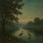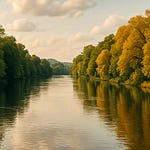 Some village friends stood upon a promontory lower down the stream to wave us a last farewell; but we, having already performed these shore rites, with excusable reserve, as befits those who are embarked on unusual enterprises, who behold but speak not, silently glided past the firm lands of Concord, both peopled cape and lonely summer meadow, with steady sweeps. And yet we did unbend so far as to let our guns speak for us, when at length we had swept out of sight, and thus left the woods to ring again with their echoes; and it may be many russet-clad children, lurking in those broad meadows, with the bittern and the woodcock and the rail, though wholly concealed by brakes and hardhack and meadow-sweet, heard our salute that afternoon.