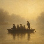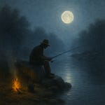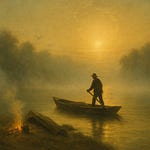 Late in the afternoon we passed a man on the shore fishing with a long birch pole, its silvery bark left on, and a dog at his side, rowing so near as to agitate his cork with our oars, and drive away luck for a season; and when we had rowed a mile as straight as an arrow, with our faces turned towards him, and the bubbles in our wake still visible on the tranquil surface, there stood the fisher still with his dog, like statues under the other side of the heavens, the only objects to relieve the eye in the extended meadow; and there would he stand abiding his luck, till he took his way home through the fields at evening with his fish. Thus, by one bait or another, Nature allures inhabitants into all her recesses. This man was the last of our townsmen whom we saw, and we silently through him bade adieu to our friends.
