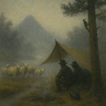 At length, when we had made about seven miles, as far as Billerica, we moored our boat on the west side of a little rising ground which in the spring forms an island in the river. Here we found huckleberries still hanging upon the bushes, where they seemed to have slowly ripened for our especial use. Bread and sugar, and cocoa boiled in river water, made our repast, and as we had drank in the fluvial prospect all day, so now we took a draft of the water with our evening meal to propitiate the river gods, and whet our vision for the sights it was to behold. The sun was setting on the one hand, while our eminence was contributing its shadow to the night, on the other. It seemed insensibly to grow lighter as the night shut in, and a distant and solitary farm-house was revealed, which before lurked in the shadows of the noon. There was no other house in sight, nor any cultivated field. To the right and left, as far as the horizon, were straggling pine woods with their plumes against the sky, and across the river were rugged hills, covered with shrub oaks, tangled with grape-vines and ivy, with here and there a gray rock jutting out from the maze. The sides of these cliffs, though a quarter of a mile distant, were almost heard to rustle while we looked at them, it was such a leafy wilderness; a place for fauns and satyrs, and where bats hung all day to the rocks, and at evening flitted over the water, and fire-flies husbanded their light under the grass and leaves against the night. When we had pitched our tent on the hillside, a few rods from the shore, we sat looking through its triangular door in the twilight at our lonely mast on the shore, just seen above the alders, and hardly yet come to a stand-still from the swaying of the stream; the first encroachment of commerce on this land. There was our port, our Ostia. That straight geometrical line against the water and the sky stood for the last refinements of civilized life, and what of sublimity there is in history was there symbolized.
